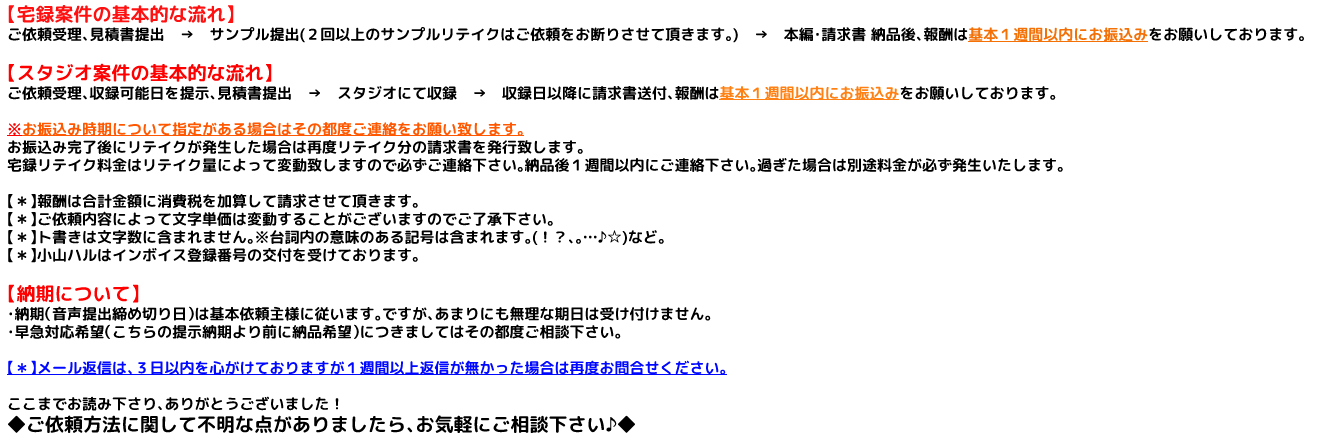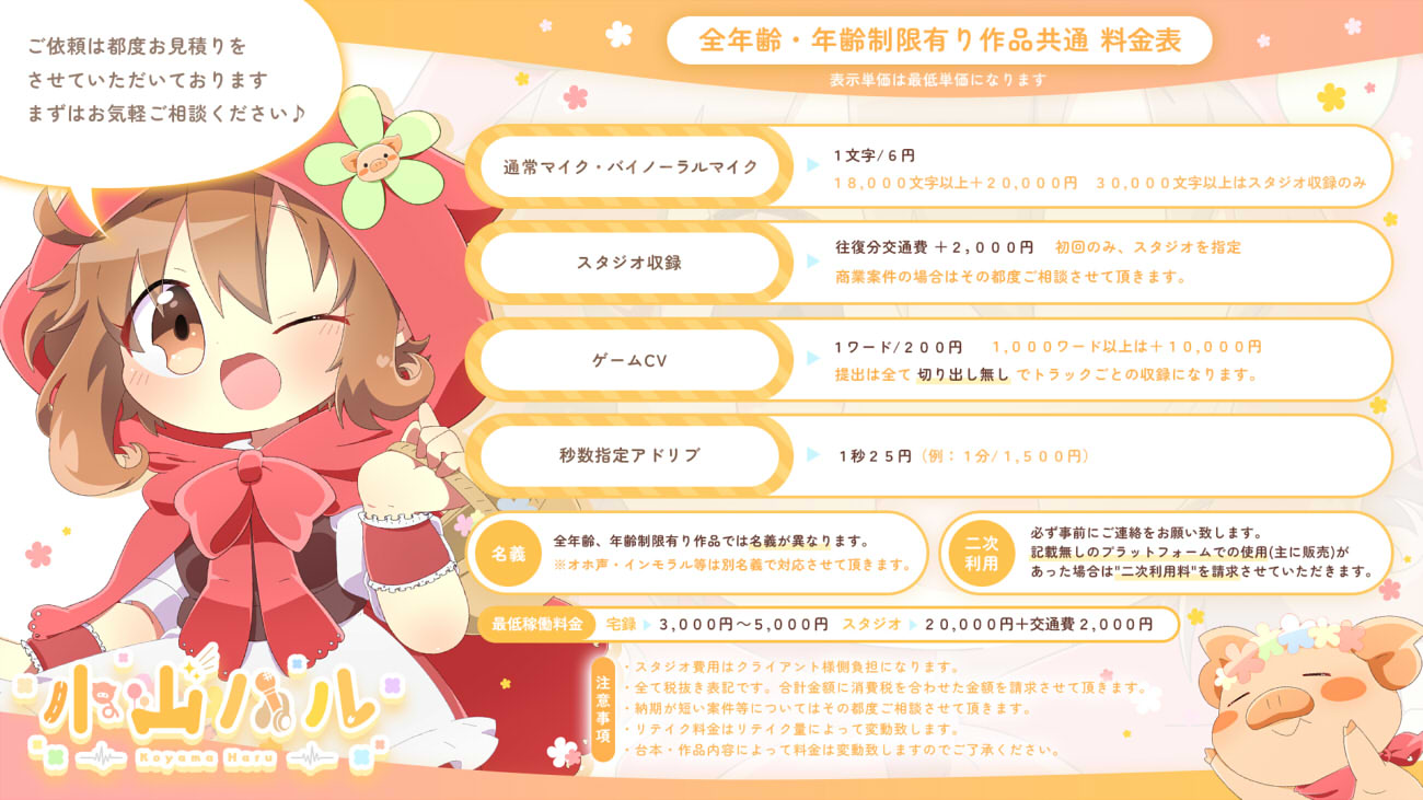 | スタジオ収録 | 往復分交通費+2,000円 ◆初回のみスタジオを指定/◆商業案件の場合はその都度ご相談させていただきます。 |